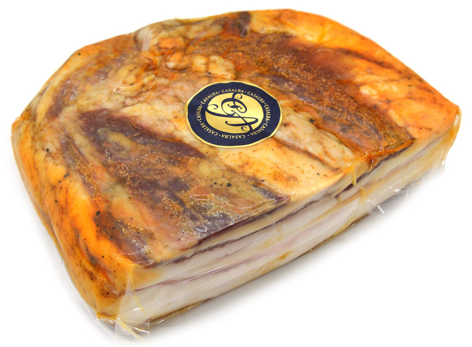 カサルバ社はブルゴスからバスク地方に通じる山あいにあり、昔から「美食の都バスク」の高級レストランでの食肉加工品の需用に応えながら、加工品の技術が培われてきました。 こちらのパンセタ・イベリコベジョータはイベリコ豚の質の高いベジョータの皮付きバラ肉を海塩で塩漬けし、その後6ヶ月間以上ジックリと発酵熟成し仕上げたパンセタは、いわば発酵熟成生ベーコンとも呼べるものです。