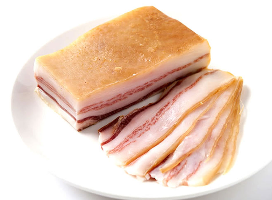 ベジョータの脂の旨みと甘みが堪能できる、生ベーコン。イタリアでいえばパンチェッタです。淡白なお肉にパンセタをトッピングに加えることにより一味も二味も違います。魚介類にもよく合います。このパンセタはスペインの三ツ星レストランで数多く採用され数々のメニューの実績からも納得のパンセタです。 |