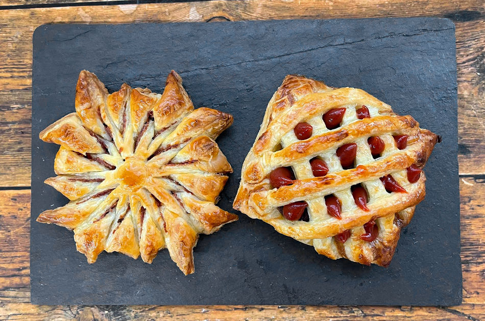 2枚のパイシートでサラミを挟んでタルトソレイユ(左)とハンバーグを挟んで簡単ミートローフパイを作りました!