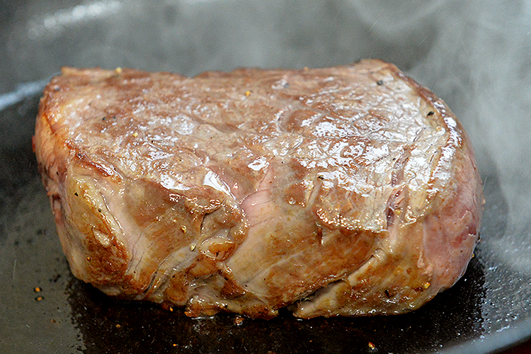 | ジューシーなステーキを焼き上げるコツは弱火でじっくり火を通すことです。中まで均一にジューシーなロゼに焼き上がります。 | |