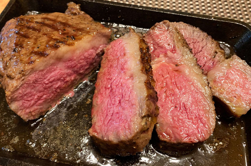 ![]() 肉の繊維に平行に切ったミニステーキです。噛んだ時の肉のジューシーさを味わえる切り方です。 |