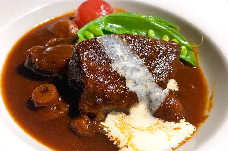 ビーフシチューは一緒に煮込んだ香味野菜をピューレ状にしてとろみをつけると優しい味わいに。