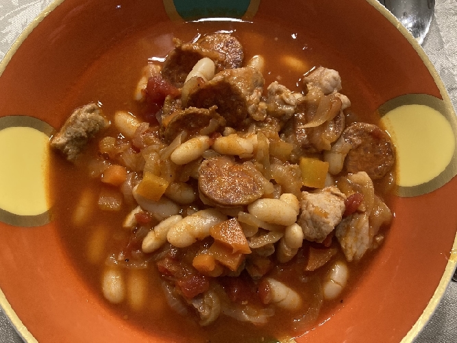 乾燥白インゲン豆を大量に下茹でしたので、今日はスペイン風の煮込みを作りました。