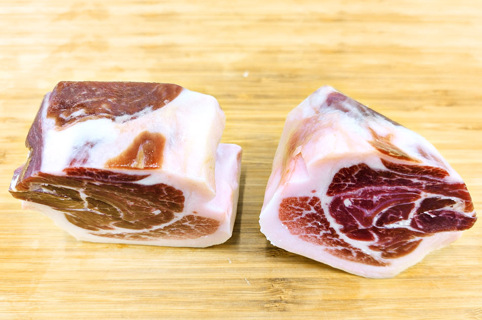 ピエルナは味わいが凝縮している部位で和名はハバキと呼ばれます。和牛などはしゃぶしゃぶで食べても美味しい部位ですがイベリコ豚のベジョータは生ハムで特に美味しく頂けます。生ハムの本場スペインでは原木から最初にカットすることで通好みの部位になります。