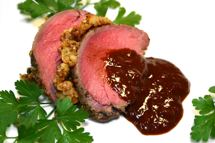 | しっとりとロゼ状に焼き上げた鹿ヒレは、驚くほど柔らかく美味しいです。クルミで包んだ鹿ヒレのロースト・赤ワインソース | |