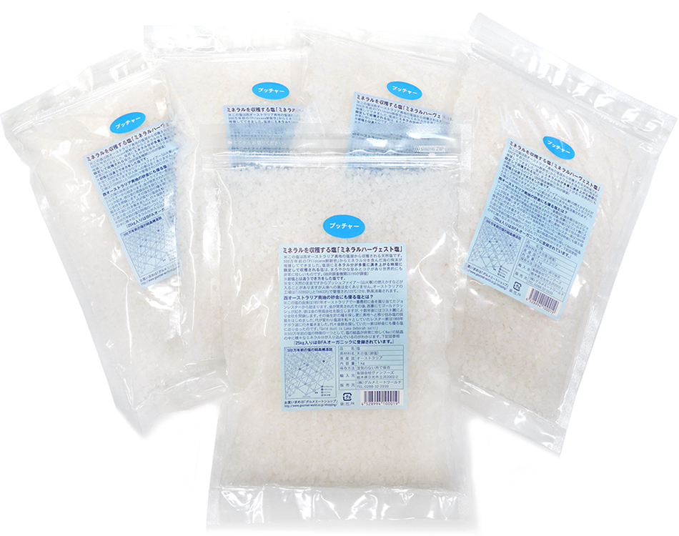 ミネラルハーヴェスト塩のブッチャーは、粒の粒子が粗いタイプですので、ソルトミルで細かく挽いて使うか、そのままゆっくりと塩分を素材に浸透させる用途に使うか、茹で湯に溶かして使うなど、用途の広い塩になります。
