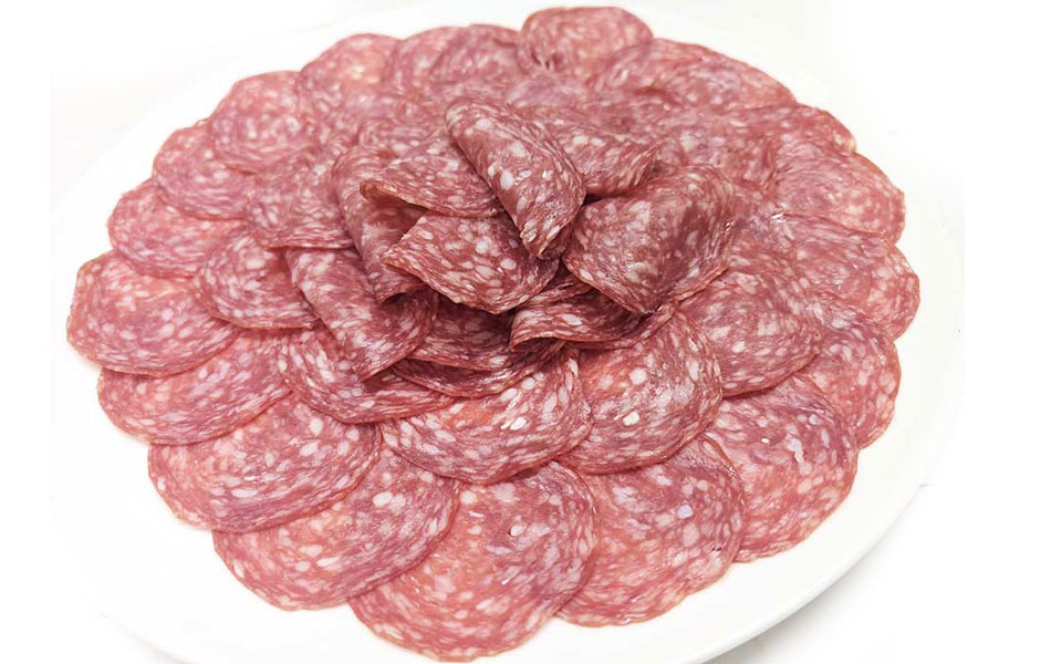 ミラノ地方を代表する伝統的なサラミがミラノサラミです。混ぜ物のない厳選された原料豚肉を使い、赤身の肩肉と少量の脂肪を均一に挽き、完全に均質なペーストにします。 これを用途に合った腸管に詰めて、手作業で糸を巻きます。 繊細な味付と良質な肉により、熟成3ヵ月後にはコクのある風味が生まれます。
