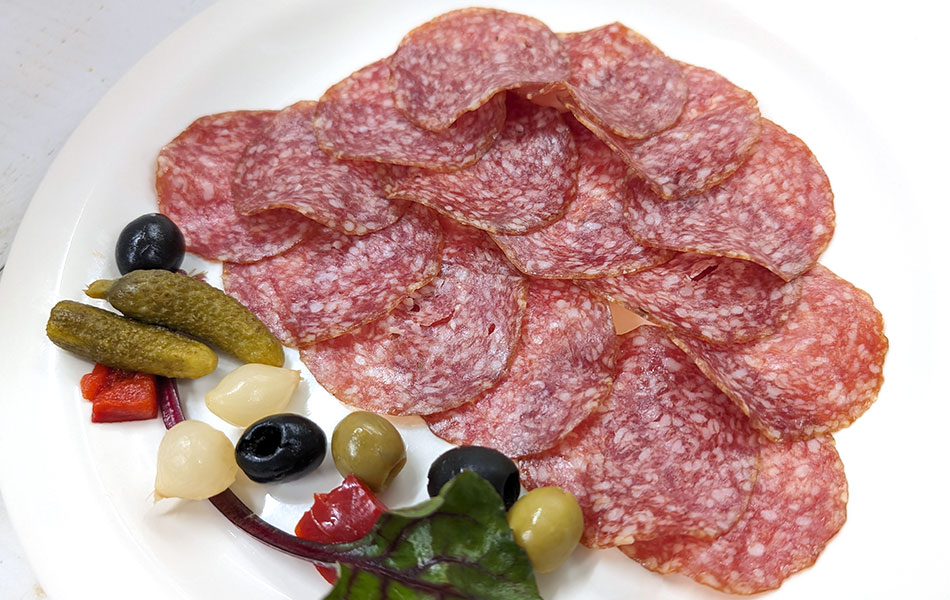 ミラノサラミって、昔から良くあるボロニアソーセージにちょっと似ているんですが、作り方や味わいは全くそうではなくってちゃんとした熟成サラミなんですね。 そして少しソフトで乳酸菌の香りがして少しだけ酸味があるんです。慣れてくるとこの乳酸菌の酸味が鼻を抜けて何とも言えない本格的サラミというか、本物を食べているんだな〜って感じる瞬間が、僕の好きなところです。