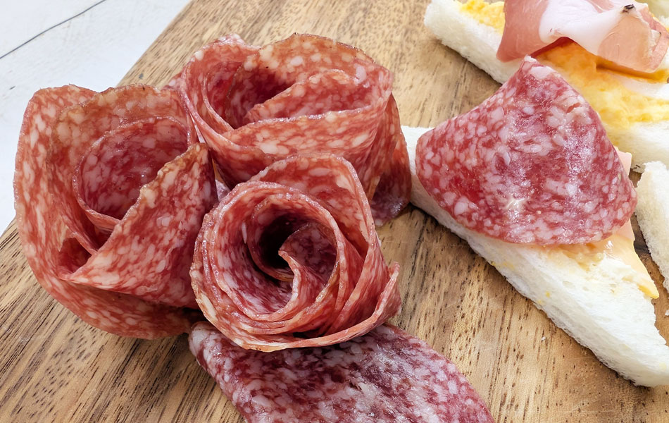 アンティパスト(前菜)はサラミが持っている独特の風味と酸味が食欲をそそりますが、軽食、セコンド ピアット(主菜)としても最適なサラミです。 パンやクラッカーなどに添えて頂くのもシンプルで美味しいです。 クレッソンやセロリなど香りと味のある野菜との相性も良く、野菜をくるっと巻いてオリーブオイルをたらせば美味しくてチョットおしゃれなおつまみの一品になりますよ。 あと一品ほしいというときに、とっても便利です。