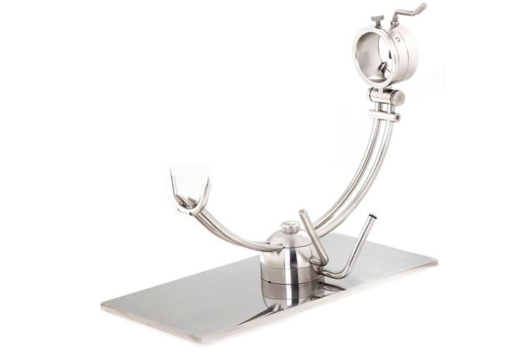 | そしてさらに上下にスイングできます!生ハムにとって最適な角度でナイフを入れる事ができ、特にコントラマサの部位のカットに重宝します♪お客様に生ハム原木の切り口を見せたりする事も容易にできますよ♪その他には足首が回転しますので、骨の回りの生ハムを回転させながらカットするにも自由自在に生ハムの姿勢を変えることが出来ます。 |