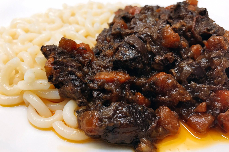 肉が煮崩れるほど煮込んで美味しい赤ワイン煮。パスタやニョッキ、ポレンタと合わせても美味しい♪