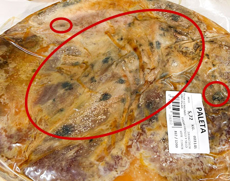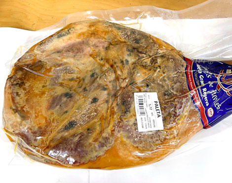 | ※生ハムはもともとカビ付けをされ熟成をされますが、出荷の際にカビをオイルで拭き取り輸出をされます。この製品は真空パックが少しあまくカビが少々出ている製品になります。カビは赤○で囲ってある部分になります。生ハムをカットする際にカビを切り取ってお召し上がり下さい。通常商品と同じ風味と味わいでお召し上がり頂けます。 | |