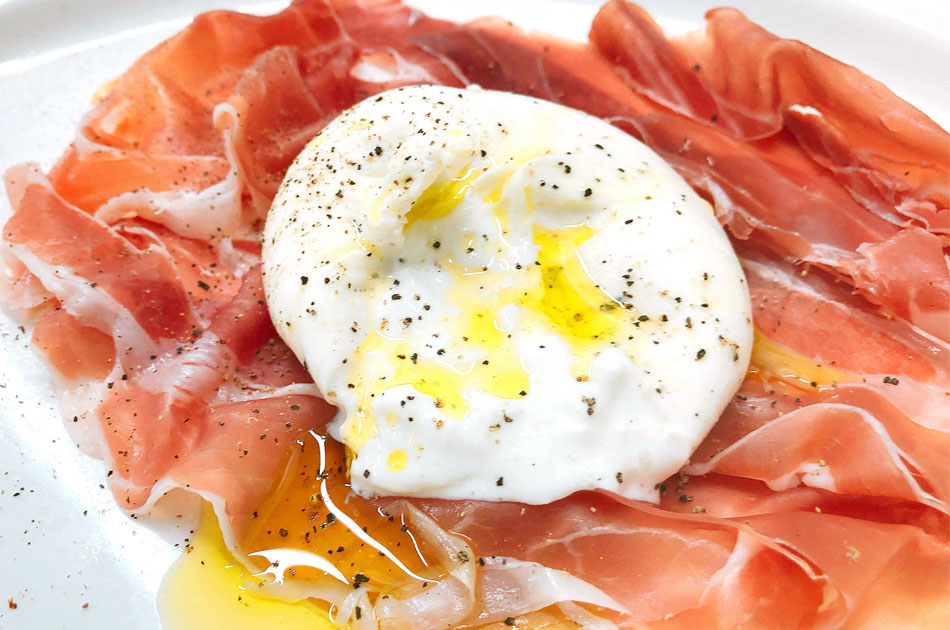 崩してオリーブオイルをかけ、生ハムと一緒にどうぞ