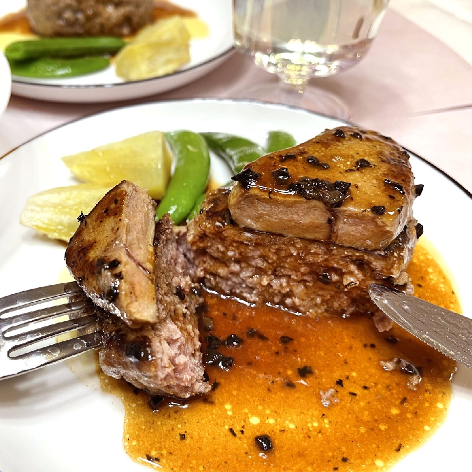 トリュフとフォアグラとハンバーグを一緒にお召し上がりください!! まったりしたフォアグラとジューシーなハンバーグ、フォンドヴォーの旨味とトリュフの風味の詰まったソースのハーモニーが口中に広がります!!