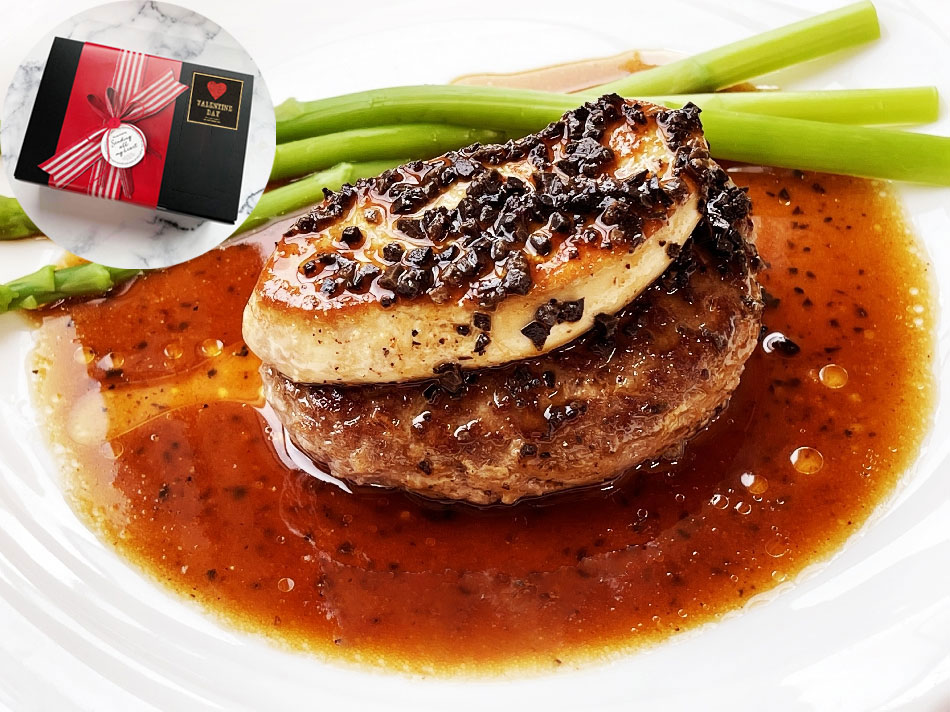 国内加工の100%ビーフハンバーグ、味が良くて焼きやすいガチョウのフォアグラ、本格派トリュフソースをセットにしたミールキットです! 作り方説明書付きで、どなたでも簡単に2人分の「ロッシーニ風ハンバーグ」をお作り頂けます ♪付け合わせだけご用意ください。