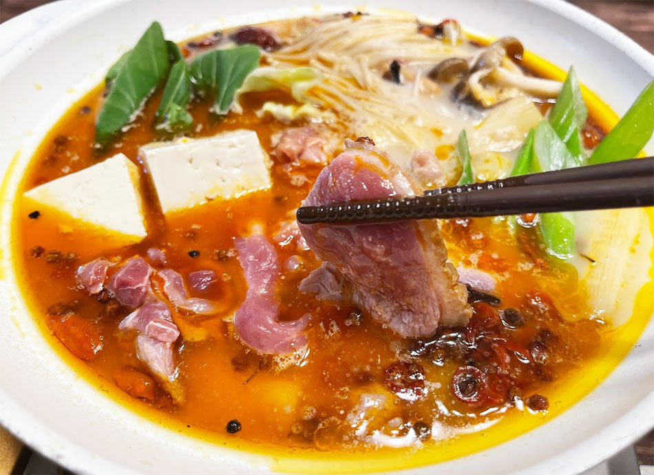 スパイシーな火鍋のスープとコクのある鴨肉の美味しさがマッチ♪お肉とつくねで約600g!3~4人で楽しめます♪