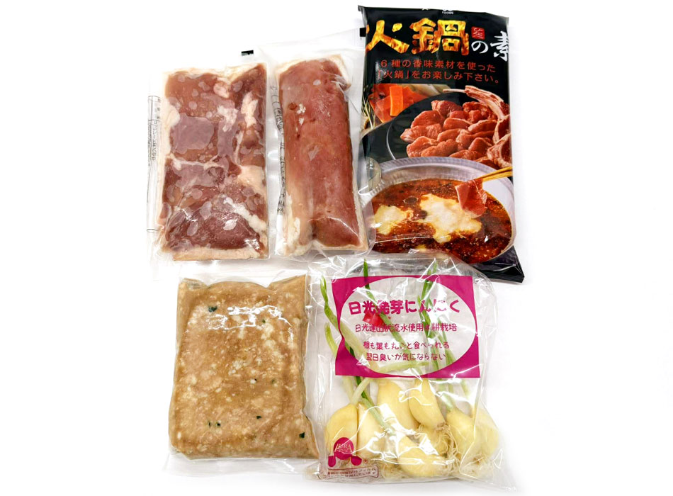 (左上から)鴨モモ肉、鴨胸肉、火鍋の素、鴨つくね、発芽ニンニク のセットです。お好みの野菜、キノコ、豆腐等をご用意ください。
