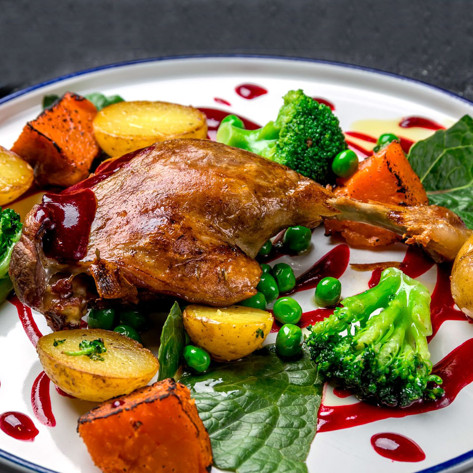 コンフィは塩漬け後の肉を低温の脂でじっくり煮込むフランスの調理技法ですが、塩漬けで旨味が引き出され脂でじっくりと煮ることによって柔らかい肉の中に閉じ込められています。合鴨の中でもクセのないものを使い表面は香ばしく、中は柔らかい食感に仕上げました。洋食のレストランで使える美味しさです♪