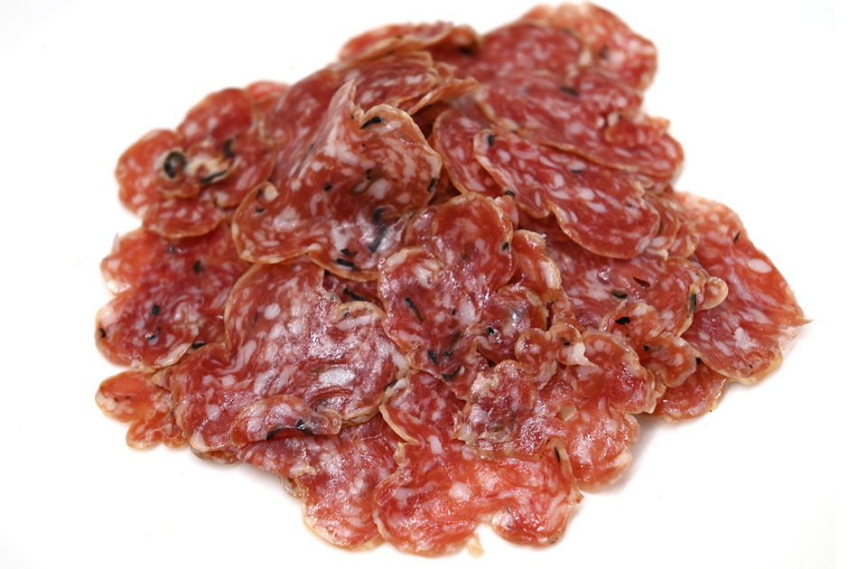 イタリア産黒トリュフを小さく刻んで ちりばめた贅沢なサラミです。食べた瞬間に、 口中にトリュフの香りが広がり、サラミの旨みが引き立ちます。