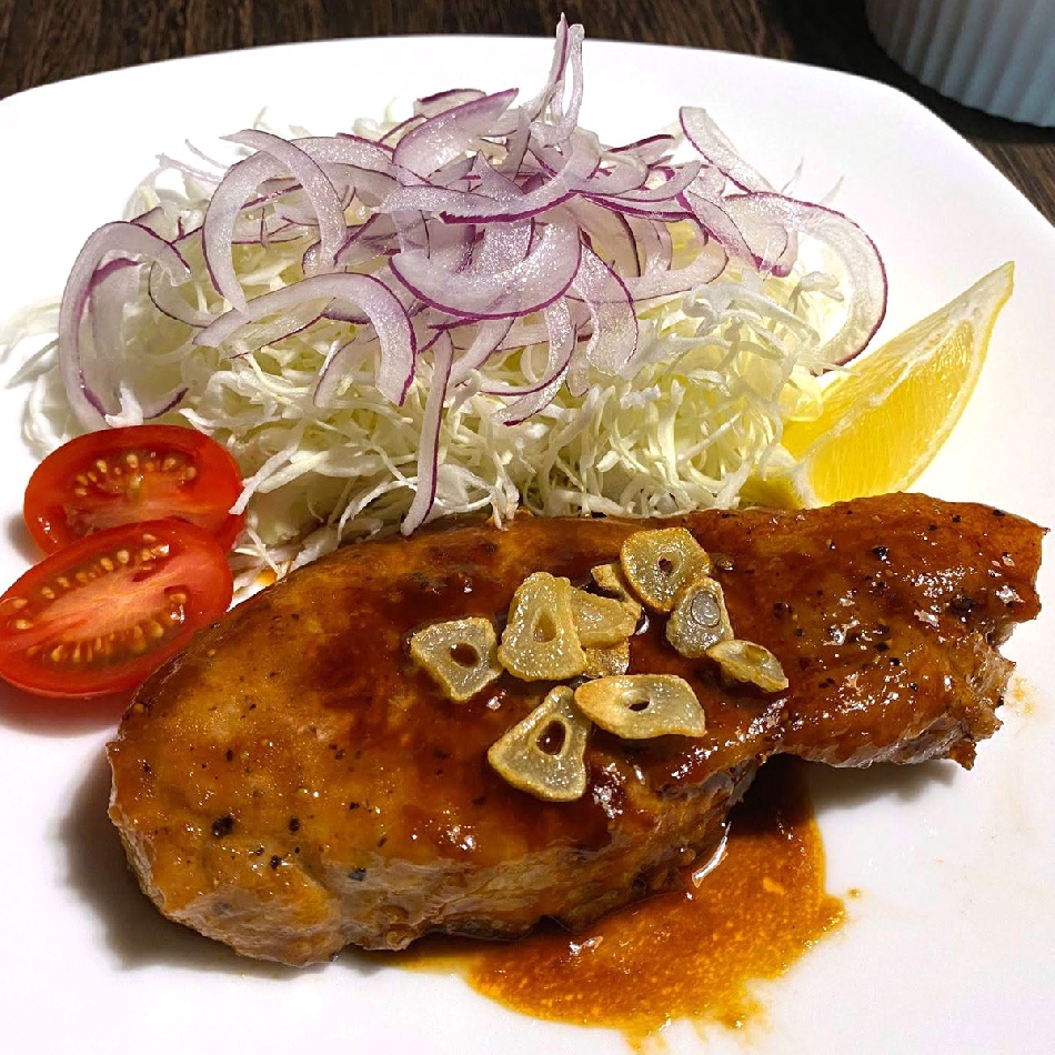 トンテキ・・・塩胡椒、粉をまぶして焼いたら、ケチャップ大さじ1、ウスターソース大さじ1、はちみつ大さじ1、レモン汁小さじ1を合わせたソースで絡めて照りを出します。