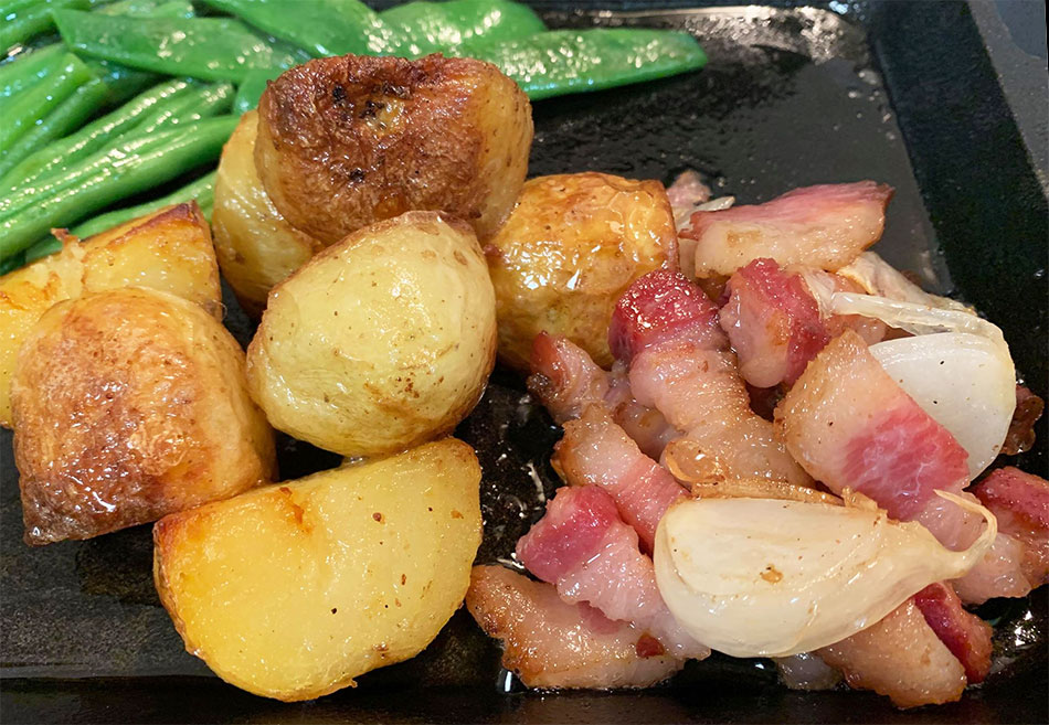イベリコ豚の熟成ベーコンを焼いて脂を出し、脂が出たら、皮付き新ジャガイモとインゲン、発芽にんにくを一緒に焼いて、軽く塩コショウで味をまとめます。イベリコの脂の甘みと燻製の風味がたまらない美味しさです。