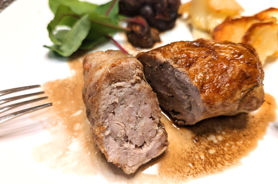 カイユの肉でソーセージミートを包んで焼いてみました。バルサミコソースもよく合います。