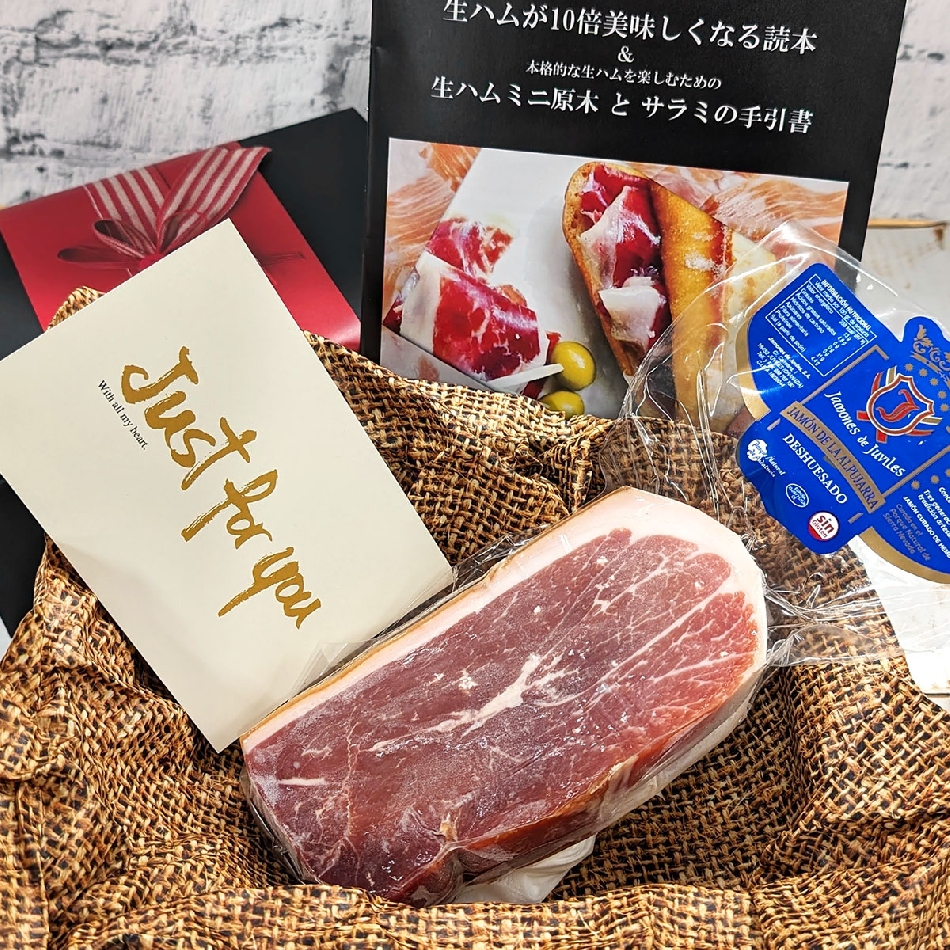 | ※各ミニ原木の形や大きさが均等でないのは、生ハムに余分な圧力をかけ長方形などにプレスしてないからです。生ハムはプレスすることで本来持っているふんわりした食感やジューシー感が損なわれるばかりでなく、肉質や脂質、滑らかな舌触りなども損なわれてしまいます。 | ||