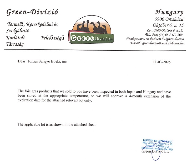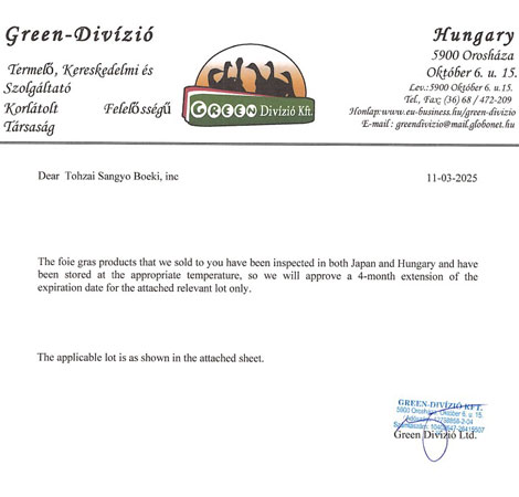 | こちらのフォアグラはメーカーが賞味期限を4か月延長保証した商品になります。現地一括表示と日本語一括表示の2枚のラベルが添付されています。 | |