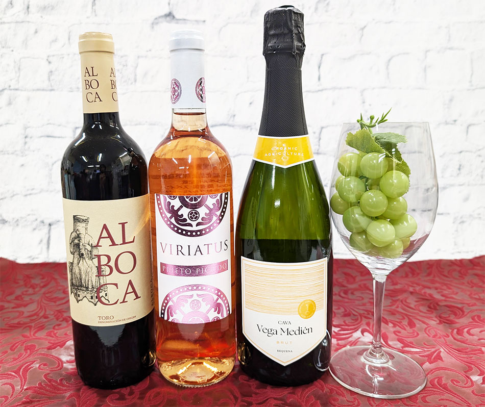 左から赤、ロゼ、泡です。家飲みにぴったりのラインナップです(^▽^)ワインが美味しくなるグラス付き♪