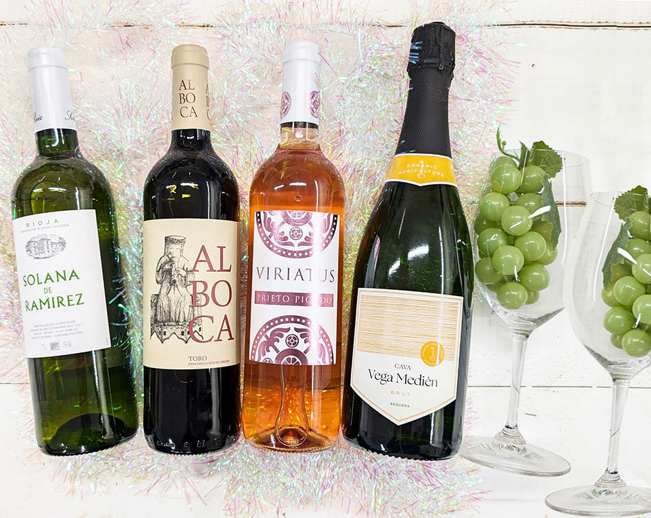 左から白、赤、ロゼ、泡の4本組です。ホームパーティや家飲み用にどうぞ♪クリスタルグラスは2脚になりました♪
