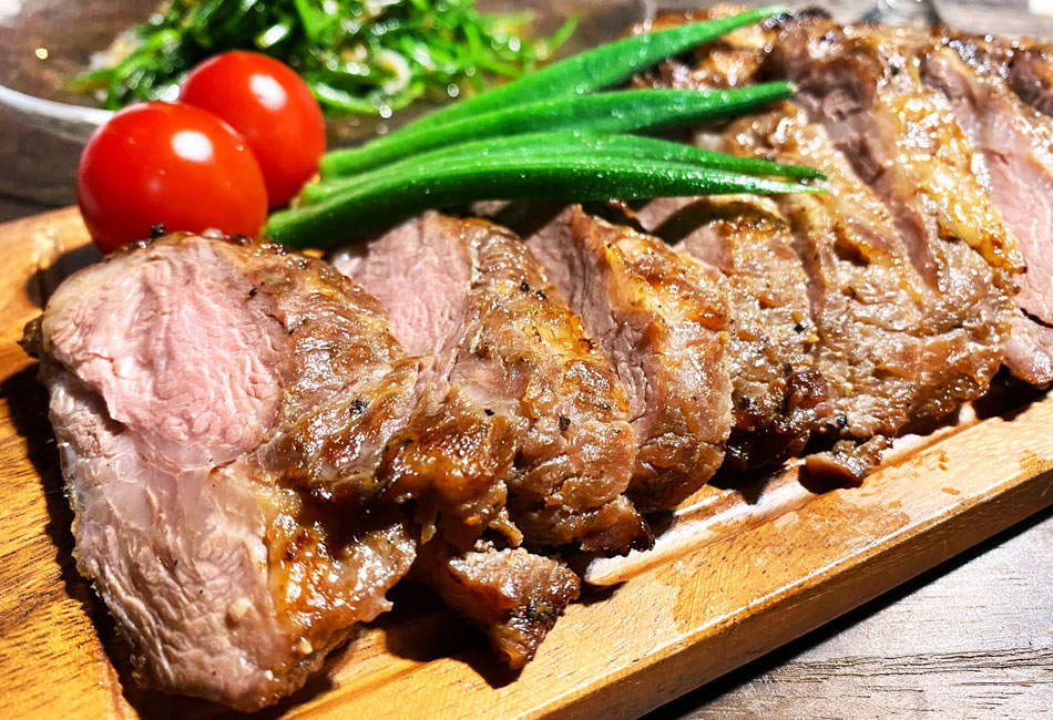 従いまして、大きなブロックで焼いて、このように切り分けることによって、肉汁溢れる美味しいお肉が焼き上がるわけですね。 このお肉を切り分ける際の注意点は、肉汁が豊富な部位なので、焼き上げてから数分間休ませてカットすることです。 プレッサほどではないですが、肉の味が濃い部位なので、人によっては、多少クセを感じるも知れませんが、ソースやタレなどで召し上がると、気にならなくなります。ご検討ください。