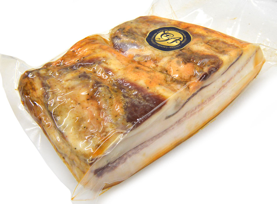 カサルバ社はブルゴスからバスク地方に通じる山あいにあり、昔から「美食の都バスク」の高級レストランでの食肉加工品の需用に応えながら、加工品の技術が培われてきました。 こちらのパンセタ・イベリコベジョータはイベリコ豚の質の高いベジョータのバラ肉を海塩で塩漬けし、その後6ヶ月間以上ジックリと発酵熟成し仕上げたパンセタは、いわば発酵熟成生ベーコンとも呼べるものです。
