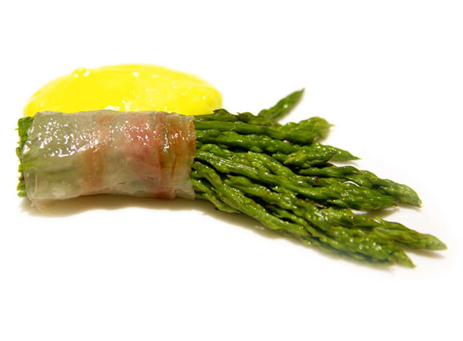 火を通すことで透き通るパンセタは、視覚の美しさはもちろんのこと、野生のアスパラの味わいをさらに引き立てます。