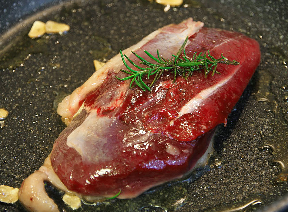1.マグレドオアは、完全に解凍してから、必ず室温に戻してください。 冷蔵庫から出したばかりのお肉をすぐに焼くと、お肉にストレスがかかってしまい、うまく焼けません。 フライパンを低温で火にかけて、皮目を下に焼き始めます。 脂がジワ~ッと出てきますので、その脂をスプーンでかけながら上面(赤身)を加熱(アロゼ)していきます。 焼きあがったらアルミホイルで包んで、お肉を休ませましょう。 すぐにカットしてしまうと、肉が落ち着かず、せっかくの肉汁が流れ出てしまいます。 |
