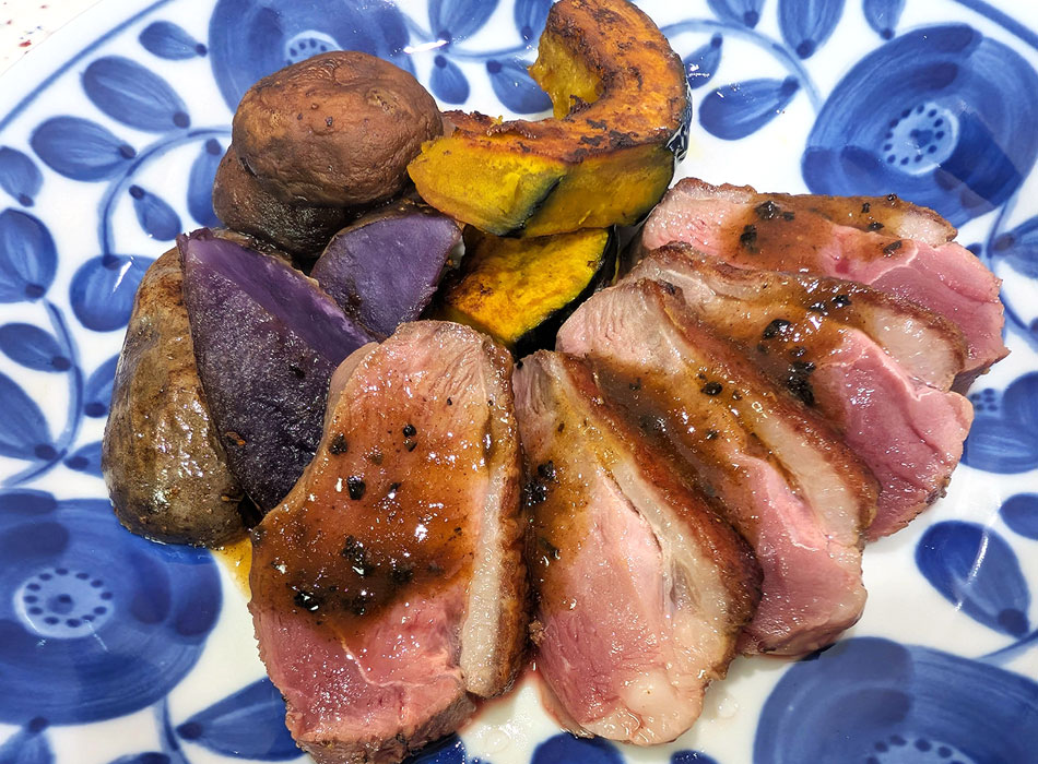 ![]() 2.オーブンでポットローストも美味しく焼けます。フライパンでしっかりと皮面を焼き、赤身をさっと焼いた後に160℃程のオーブンに入れ均等に火を通します。焼き加減は鉄串を通して確かめるか、刺して肉汁が出てきたら仕上がりです。アルミ箔で包んでホールディングをすると肉汁が落ち着きます。 |