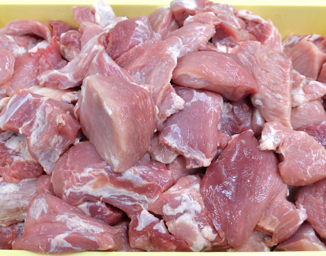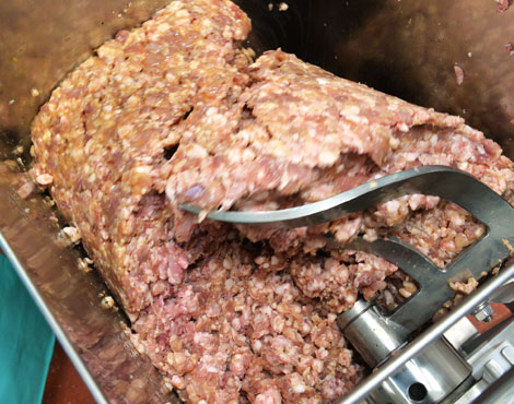![]() 鮮度の良いモモ肉と首肉をミンサーで粗挽きにします。 |