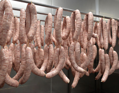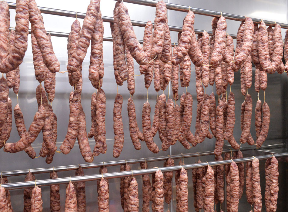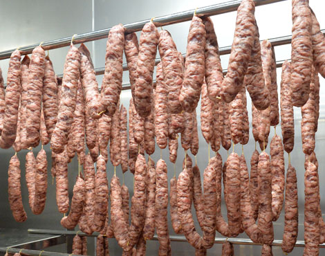 ![]() 腸詰めされたラプチョンは熟成庫に吊され1ヶ月後に製品になります。 |