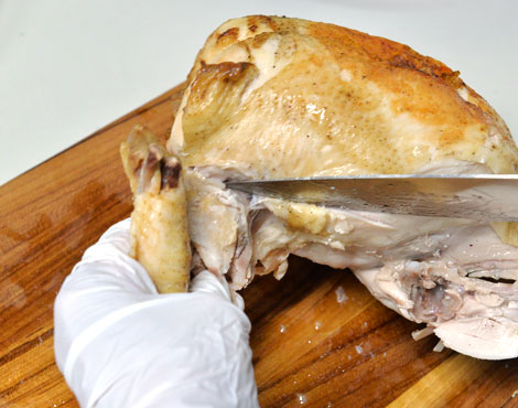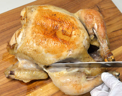 ![]() モモ肉からカットしていきます。片手で足首をつまんで軽く引っ張り、付け根からナイフを入れて行きます。 |