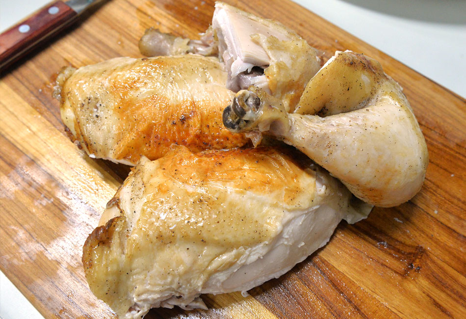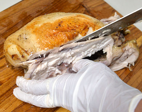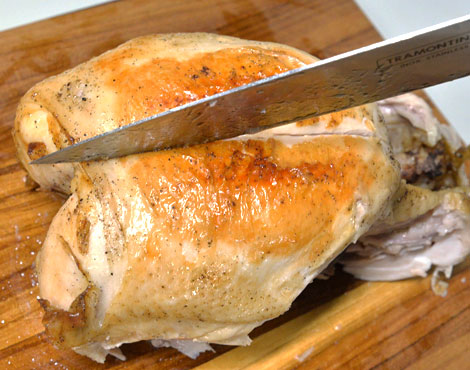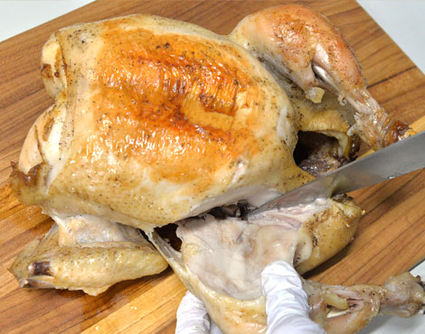 ![]() 残りの胸肉も同様に骨に沿ってナイフを滑らすようにカットし、胸肉を切り取ります。 |