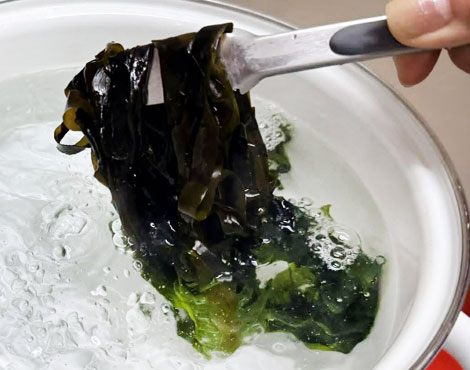 ◆ 採れたて!生ワカメの基本の下処理産地直送の「茶色の生ワカメ」は、磯の香りと歯ごたえが格別です。美味しく食べるための**「色の変化」**をぜひ楽しんでくださいね! 重要:解凍後はスピード勝負! 生ワカメは酵素が強いため、解凍して放置するとドロドロに溶けてしまいます。解凍したら、すぐに以下の手順で仕上げてください。 1. 解凍:パッケージのまま流水に当てて解凍します。 2. 水洗い:大きめのボウルに水を溜め、汚れを落とすようにさっと洗います。 3. 湯通し(ここが見どころ!):沸騰したたっぷりのお湯にワカメを投入。茶色がパッと鮮やかな「緑色」に変わります! この瞬間が一番の楽しみです。 4. 冷水で締める:色が変わったら(数秒〜10秒程度)すぐにお湯から上げ、冷水(氷水がベスト)にとって冷やします。これで色が鮮やかに定着します。 5. 水気を切る:手でギュッと絞ってしっかり水気を切れば完成です! |