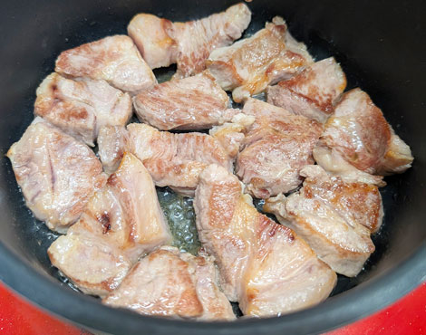 ![]() 日光HIITSU豚肩ロースの切り身を一口大にカットして両面こんがり焼きます。 |