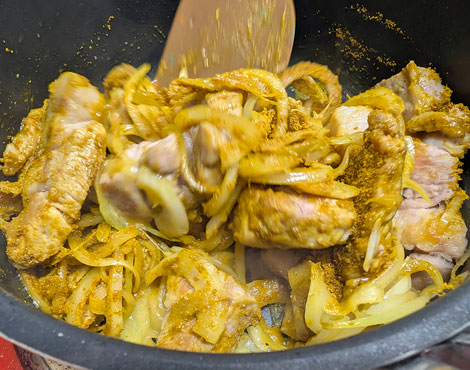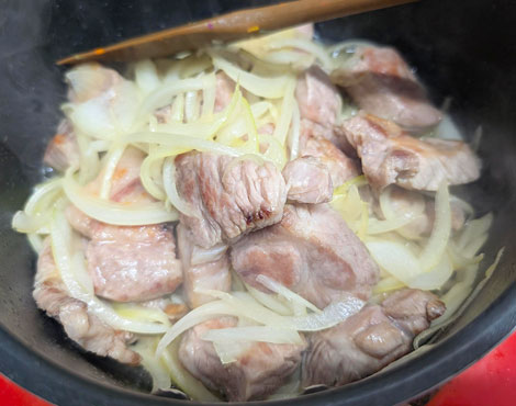 ![]() スライスした玉ねぎを加えたら軽く炒めます。 |