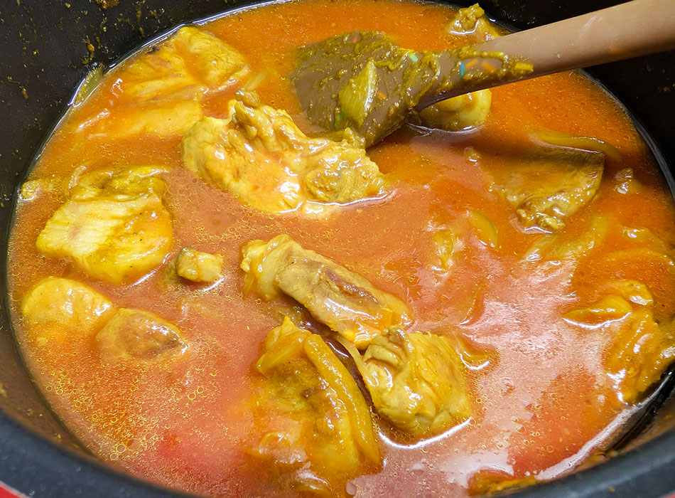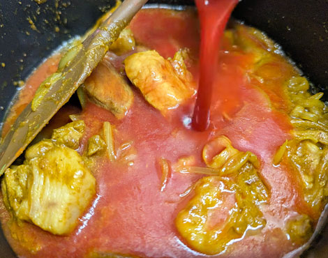 ![]() トマト缶orトマトジュースと水を加えて煮込みます。 |
