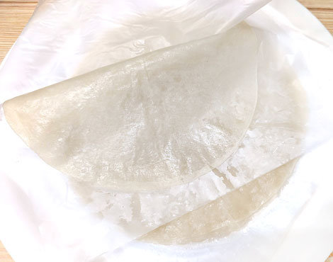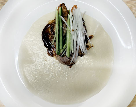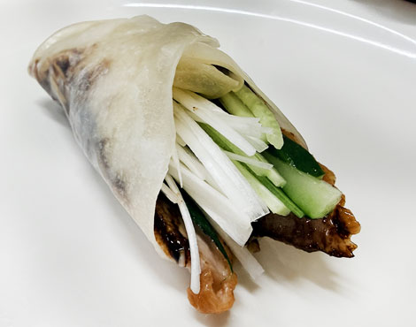 ![]() カオヤーピンのやや上部にタレを塗り、北京ダック、きゅうり、白ネギをお好みで載せます。真ん中より上の方に乗せた方が包みやすいです。 |
