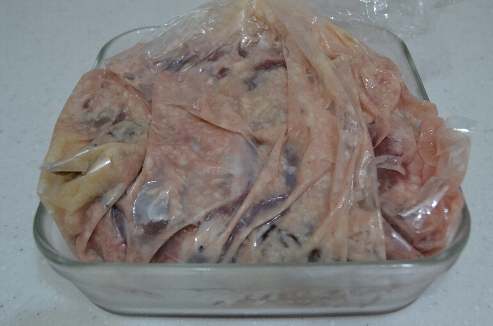 1.解凍後、ちぎった八角の片を入れた塩麴にお肉を入れて密封して3日間冷蔵庫で漬け込みます。