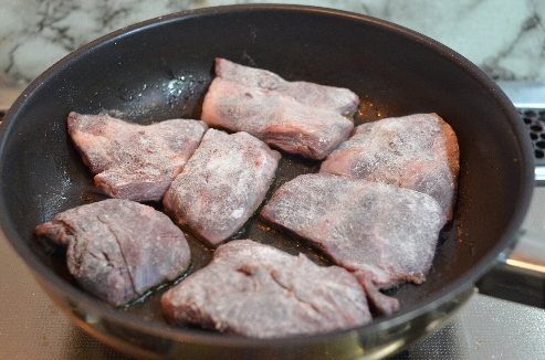 1.解凍したお肉に塩胡椒し、小麦粉をつけてはたき、オリーブオイルをひいた中火のフライパンで焼き目をつけます。