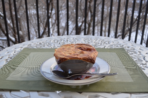 10cm角のパイシートを14cmに伸ばし、角に耐熱性の器に鹿のシチューと茹でた野菜を入れ、伸ばしたパイシートで覆い、パイにフォークで空気穴を開け、牛乳をはけで塗り、220度のオーブンで17分位焼いて出来上がりです。