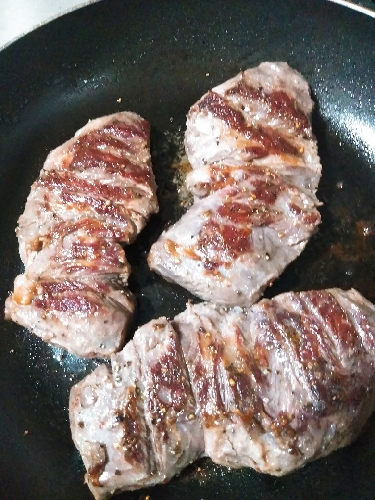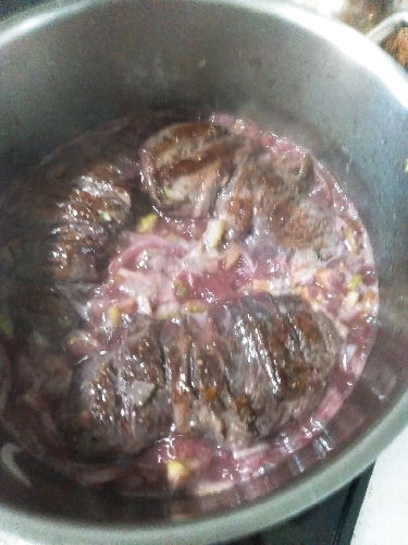 ① 解凍して室温に戻した鹿肉に塩胡椒して、バターで両面を焼いて焼き色を付ける。 ② 刻んだニンニクとスライスしたたまねぎを①に追加し炒める。 ③ ワインと刻んだセロリ、マッシュルームを入れて蓋をして煮込む。水分が減ったら水かワインを足して肉が柔らかくなるまで煮込む。30分~1時間くらい。 ④ トマトケチャップとデミグラスソースを入れて混ぜながら弱火で煮込む。