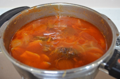 4.沸騰してきたら、火を弱め、軽く灰汁を取り、蓋をして圧力がかったら、3分圧力をかけて自然放置します。