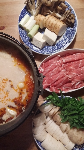 先日、知人に火鍋のお店に連れていってもらいました。 そこのお店では、羊肉を食べさせるのがウリ。薄くスライスされた羊肉は臭みも少なくて美味しく、「羊肉の火鍋って美味しいんだ。また食べたいなぁ。」と思っていたところ、このセットを見つけて迷わず購入しました。 用意したのは、お店を参考に、長芋、レンコン、大根、ねぎ、春雨。そして家にあった、舞茸、春菊。スープの素を水に溶かして火にかけると、花山椒の良い香りがふわっと部屋に漂います。 届いたお肉は、薄く綺麗にスライス、ラッピングされていたので、お店と同じように、一枚ずつとって火鍋に泳がせることができました。しゃぶしゃぶのように、色が変わったところで、さっと引き上げて食べると固くならないのでおすすめです。 ちょっと足りないかな、と思っていましたが、夫と二人で食べて満足。大根や長芋、レンコンと辛いスープの相性もよく、野菜も全部食べ切り、最後はインスタントラーメンの麺だけを、残ったスープにいれて食べました。これも美味しい!薬膳では羊は体を温める肉とされているようで、そのおかげか、食べた後はほっかほか。 お店で食べるよりずっとお手頃だし、美味しいし、大満足でした。 今回は、土鍋ではなく、すき焼き鍋でしてみたところ(そんなに脂もしみていなかったので)、お店のような雰囲気に。ナツメやクコが浮かぶスープは、見ているのも楽しく、辛いのが苦手でない方には、おもてなしにもつかえそうです!